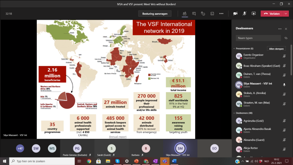 During the meeting, hosted by IVSA the Netherlands, VSF the Netherlands and VSF Germany and VSF International students were introduced to the international work of Vets without Borders (Vétérinaire Sans Frontière (VSF)). International representatives from VSF explained their projects and how they contribute to developing veterinary healthcare on different continents. In addition to this, the students from VSF the Netherlands presented their activities and how you can get involved as a student.